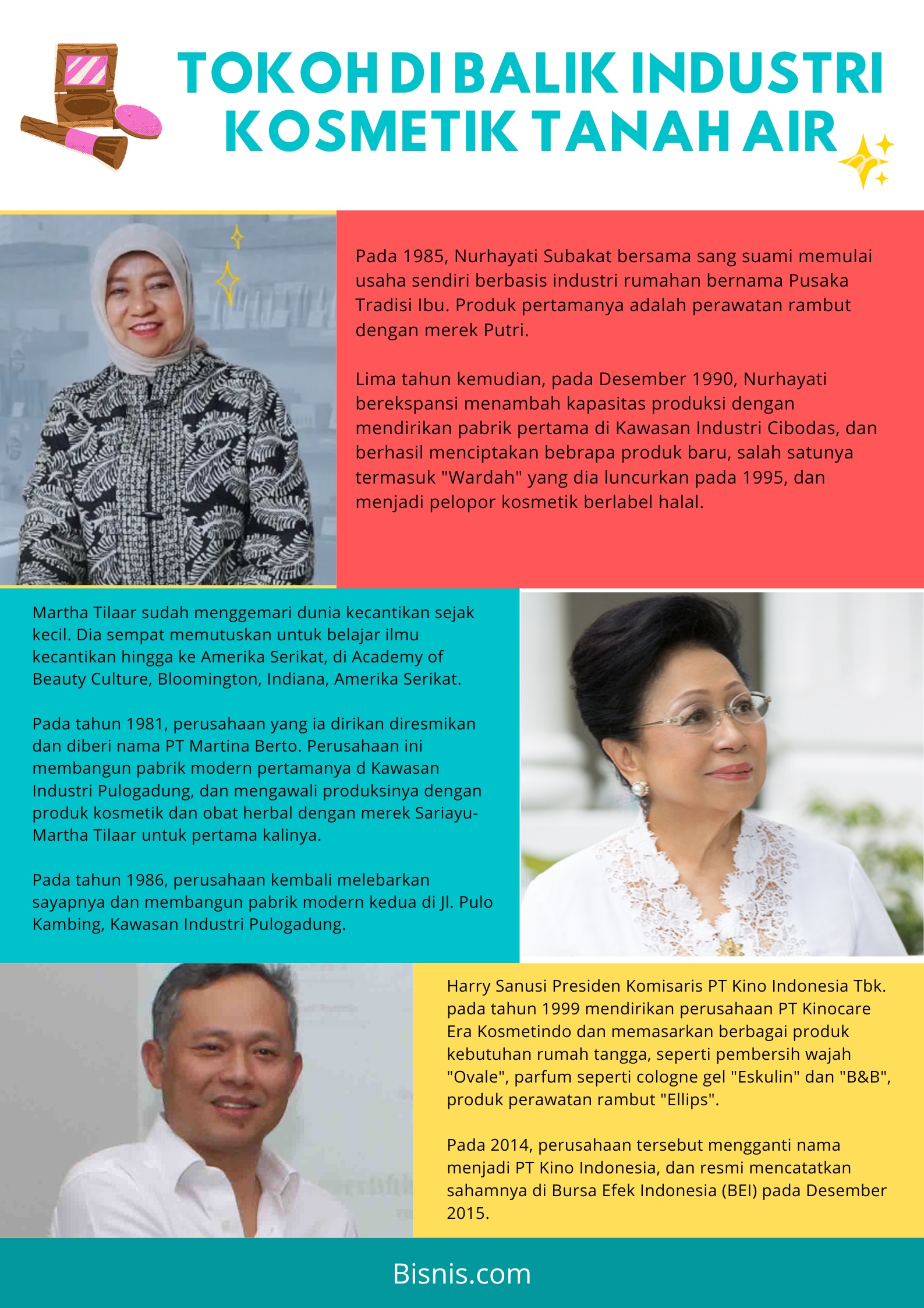 Martha Tilaar, salah satu tokoh penting dalam industri kecantikan Indonesia, memulai bisnisnya dari salon kecil di garasi rumah orang tuanya. Produk-produknya, seperti Sariayu-Martha Tilaar, menjadi pionir dalam menghadirkan kosmetik yang sesuai dengan kulit orang Indonesia. Martha Tilaar Group terus berkembang dan menjadi salah satu brand ternama di tanah air.