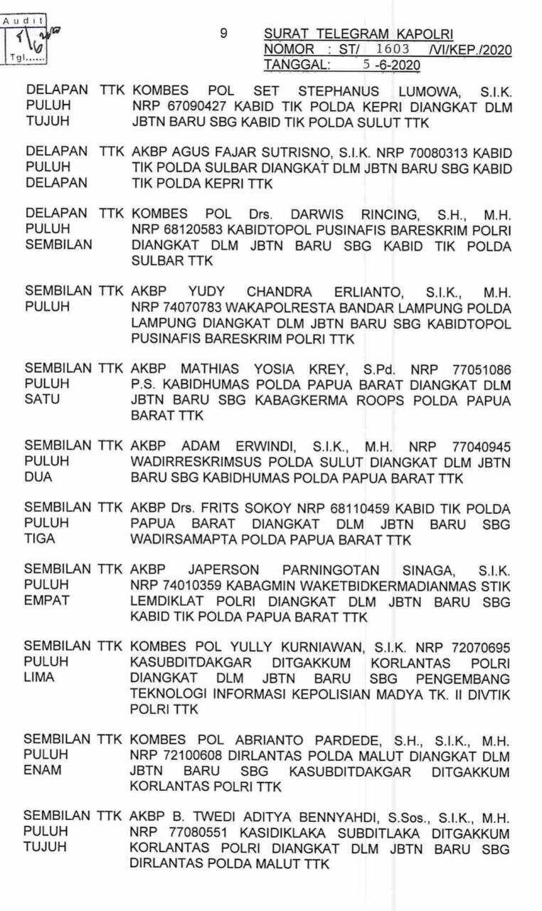 - Kombes Pol Dedi Ardiyanto Kabid TIK Polda Banten diangkat dalam jabatan baru sebagai Auditor Kepolisian Madya TK. III Itwasda Polda Jatim.
