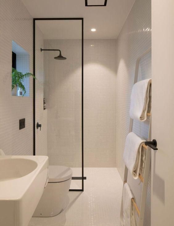 Gunakan sekat kaca untuk membuat kamar mandi tampak lebih luas. Selain itu, gunakan rak di dinding alih-alih lemari yang memakan tempat.