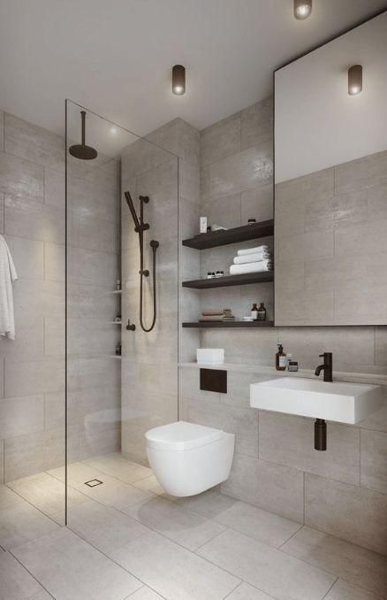 Pemilihan warna full abu-abu bisa mewujudkan kamar mandi minimalis modern. Namun, hanya letakkan barang yang primer seperti bath up, shower, dan closet.