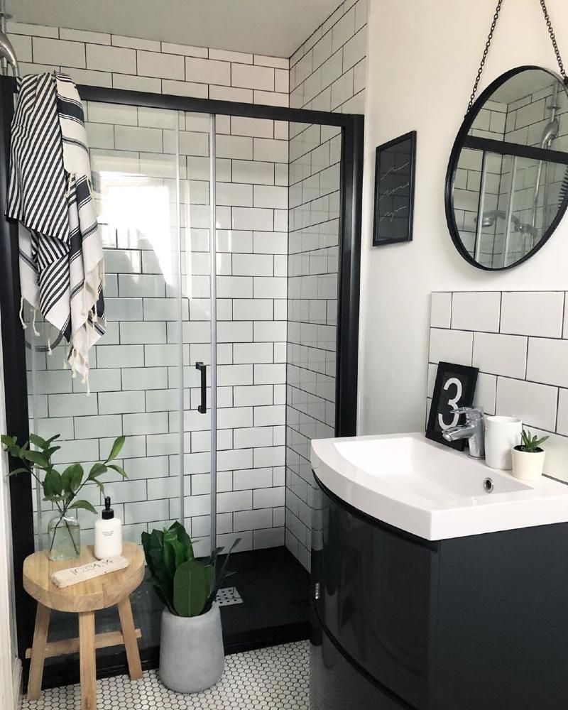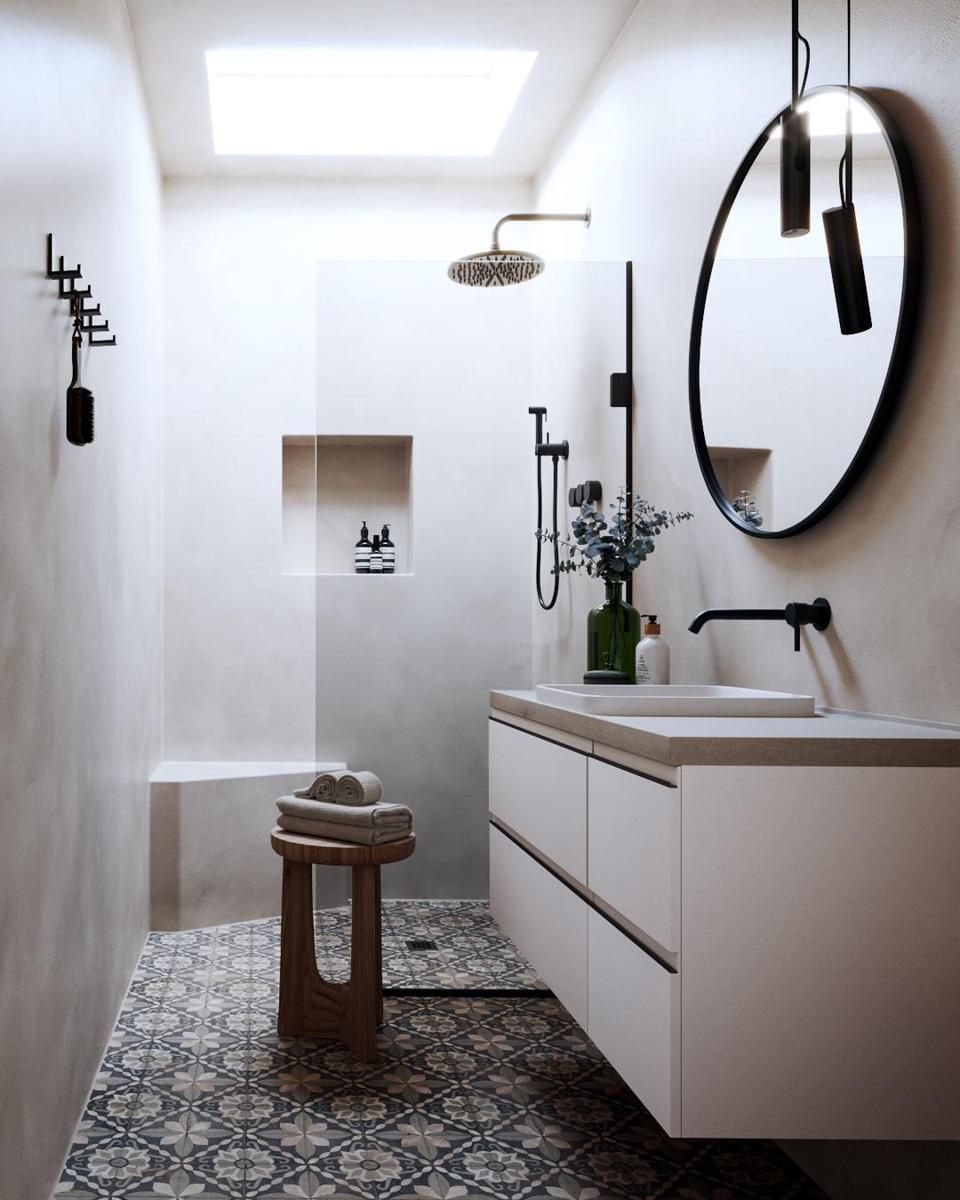 Konsep monokrom memang mudah diterapkan dalam kamar mandi minimalis. Tinggal lakukan permainan motif antara dinding dan lantai sesuai keinginanmu.