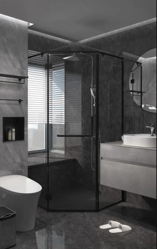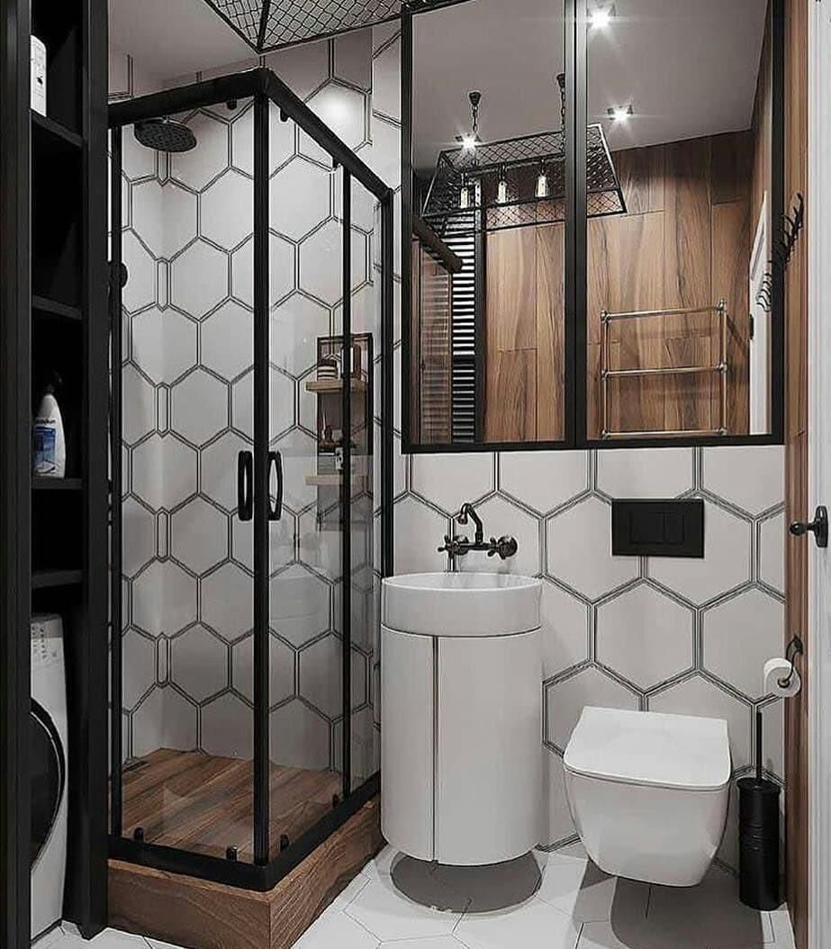 Desain gelap bisa menjadi pilihan yang berani jika kamu bosan dengan kamar mandi minimalis yang penuh warna. Padukan dengan warna putih dan kaca supaya tidak terlalu muram.