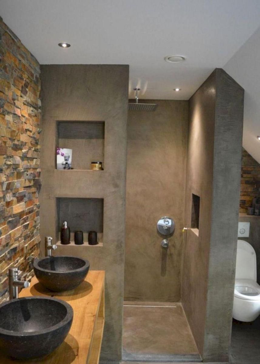 Unfinished walls dan stainless terlihat sangat keren! Bernuansa maskulin, kamar mandi ini tidak memerlukan renovasi besar-besaran.