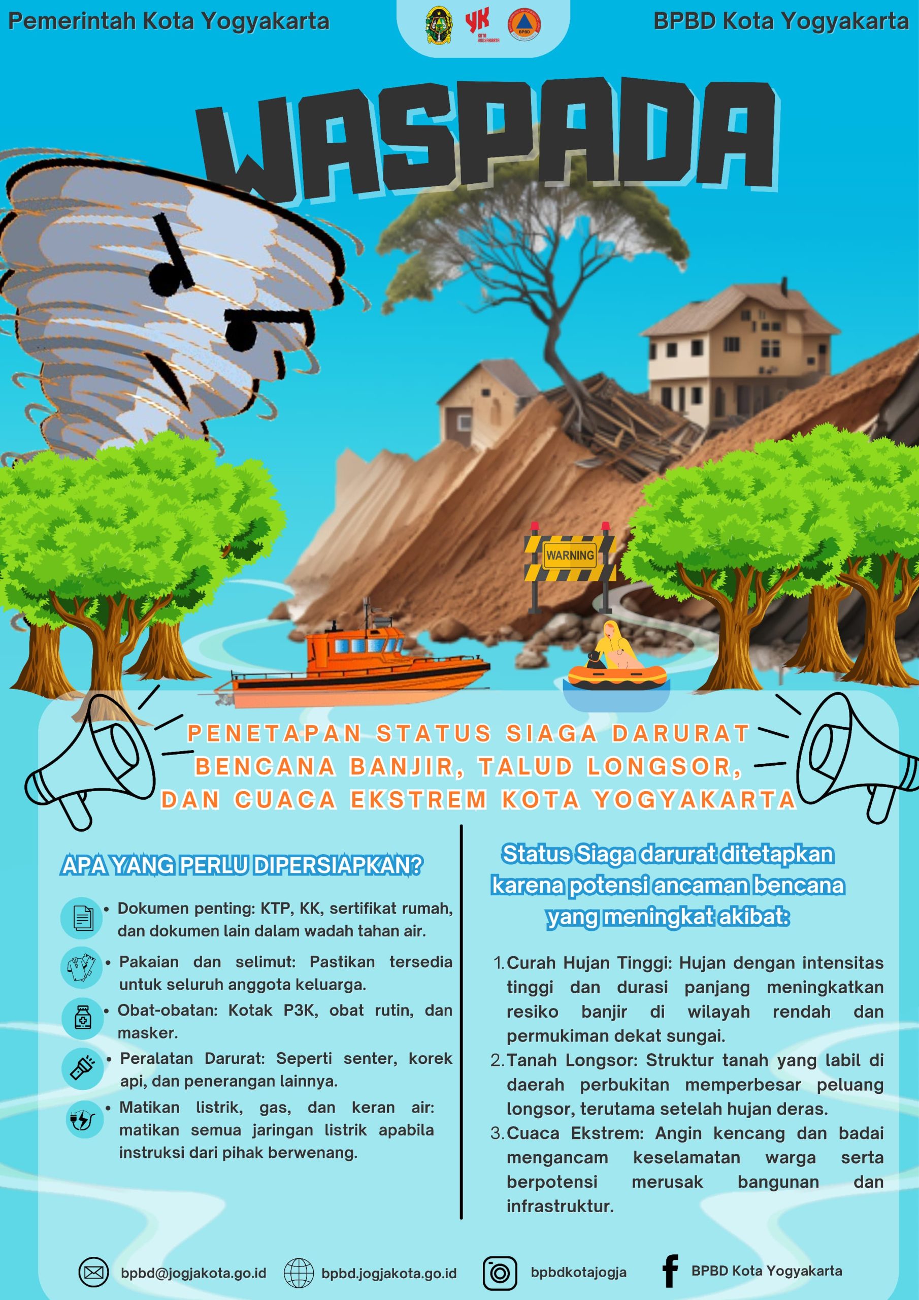 Pastikan selalu mengikuti pembaruan cuaca dan peringatan dini melalui kanal resmi BMKG, BNPB, pemerintah daerah, serta informasi lalu lintas dan evakuasi di sekitar wilayah tempat tinggal. Simpan nomor darurat berikut untuk antisipasi: