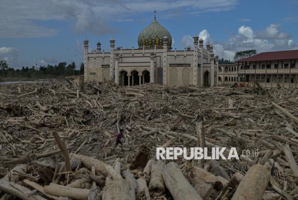 Bangunan masjid Pesantren Darul Mukhlisin yang dikepung oleh tumpukan kayu gelondongan di Desa Menanggini, Aceh Tamiang, Aceh, Jumat (19/12/2025). Tumpukan gelondongan kayu masih mengepung area Pesantren Darul Mukhlisin setelah 23 hari bencana banjir bandang menimpa kawasan tersebut. Warga berharap ribuan kayu gelondongan tersebut segera dibersihkan agar aktivitas warga dan pesantren tidak terhambat. – (/Thoudy Badai)