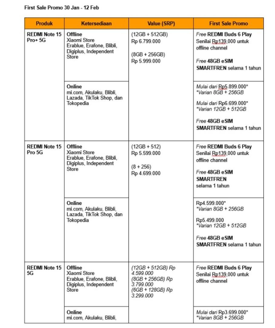 Xiaomi Indonesia akan segera membuka penjualan perdana dari REDMI Note 15 Series pada 30 Januari 2026. Dalam kesempatan ini, konsumen di Indonesia memiliki kesempatan untuk memperoleh perangkat yang sangat diminati melalui berbagai saluran resmi Xiaomi, mulai dari platform e-commerce hingga jaringan toko Xiaomi terdekat di seluruh Indonesia.