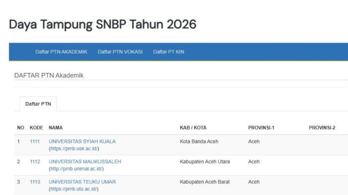 • Daftar program studi dan daya tampung SNBP dapat dilihat pada submenu Daya Tampung PTN SNBP