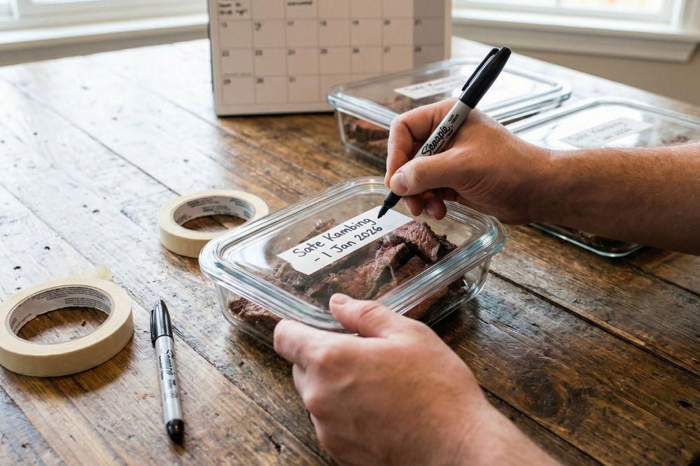 Tuliskan jenis daging (misal: “Sate Kambing” atau “Iga Bakar”) dan tanggal penyimpanannya (misal: “1 Jan 2026”). Label ini akan menjadi pengingat bagi Mama untuk mendahulukan mengonsumsi daging yang disimpan paling awal (First In, First Out).