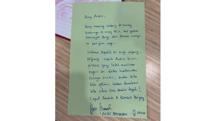 “Selama Republik ini punya pejuang-pejuang seperti Andrie Yunus, pribadi yang lebih mencintai negeri ini di atas keselamatan dirinya sendiri, maka kita bisa optimis bahwa demokrasi kita akan terus berdiri tegak! Cepat sembuh dan kembali berjuang!” demikian isi surat dari Anies untuk Andrie Yunus.