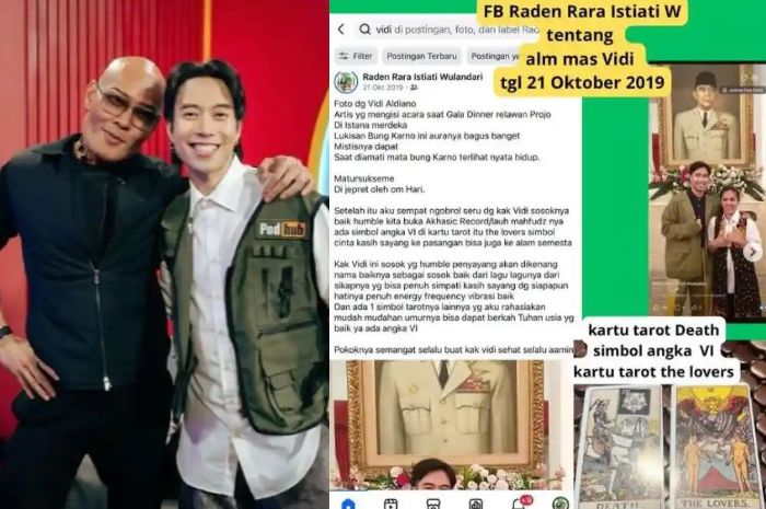 “Ini postingan 2019 masih ada di pencarian medsos FB #raraistiatiwulandari fotoku dg mas Vidi Aldiano @vidialdiano di istana merdeka saat jamuan makan relawan gabungan setelah pelantikan Presiden Jokowi & Wapres Abah Amin. Mas Vidi salah satu relawan juga pengisi Acara,” tulis Mbak Rara di akun Instagram pribadinya @rarapawang_cahayatarot.