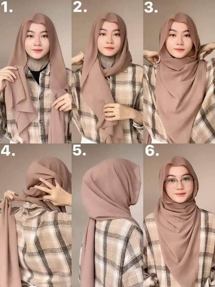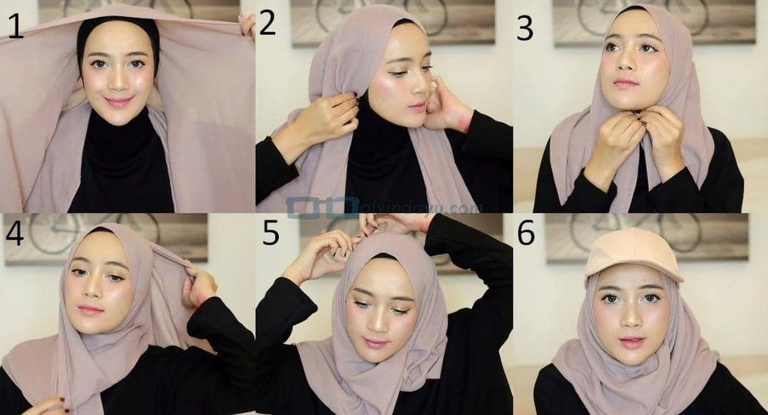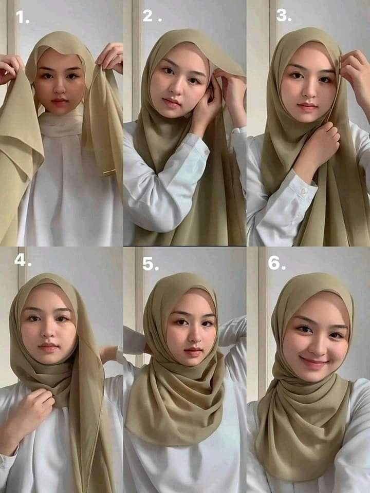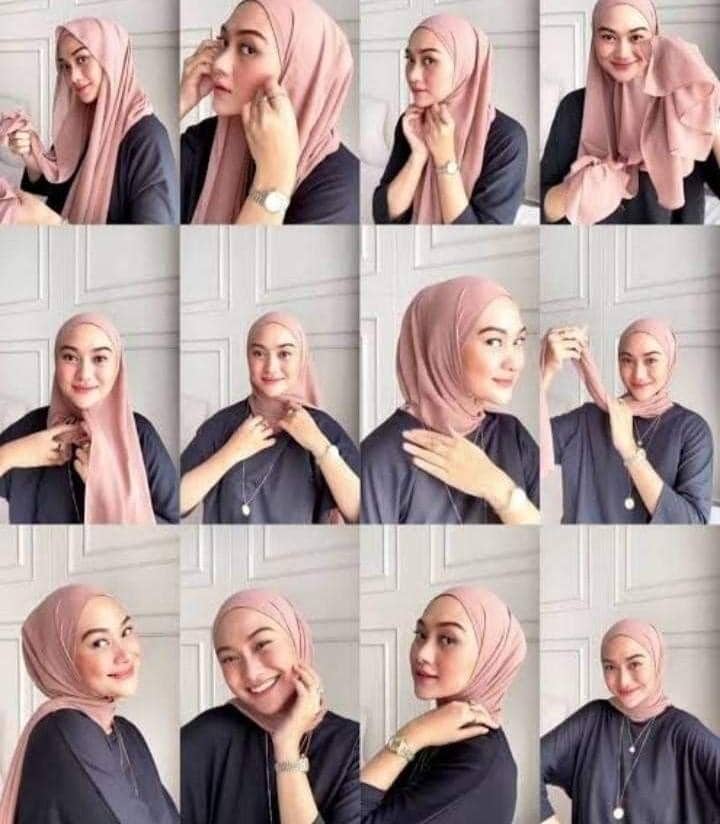 Untuk model hijab yang syar’i, pilih bahan pashmina yang lebar dan tidak menerawang. Langkah-langkahnya: