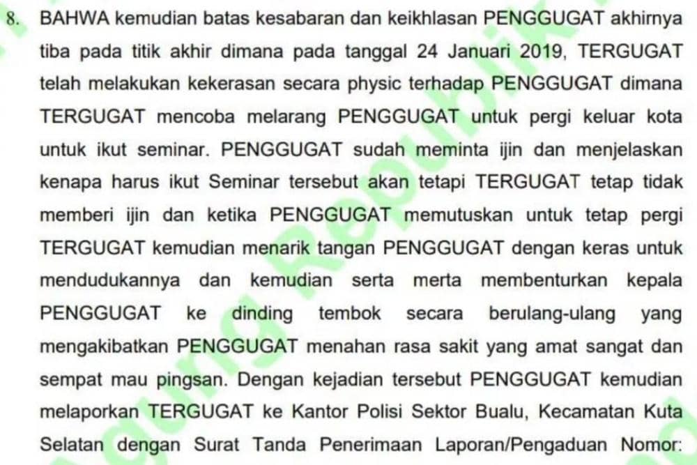 “Kemudian serta merta membenturkan kepala Penggugat ke dinding tembok secara berulang-ulang yang mengakibatkan Penggugat menahan rasa sakit yang amat sangat dan sempat mau pingsan,” bunyi kutipan dalam putusan tersebut.