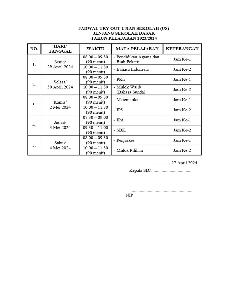 Untuk jenjang SD, TKA dijadwalkan berlangsung pada 20–30 April 2026. Selain itu, Kemendikdasmen juga telah menyiapkan jadwal ujian susulan sebagai langkah mitigasi jika terjadi kendala teknis seperti gangguan listrik atau jaringan internet akibat cuaca ekstrem.