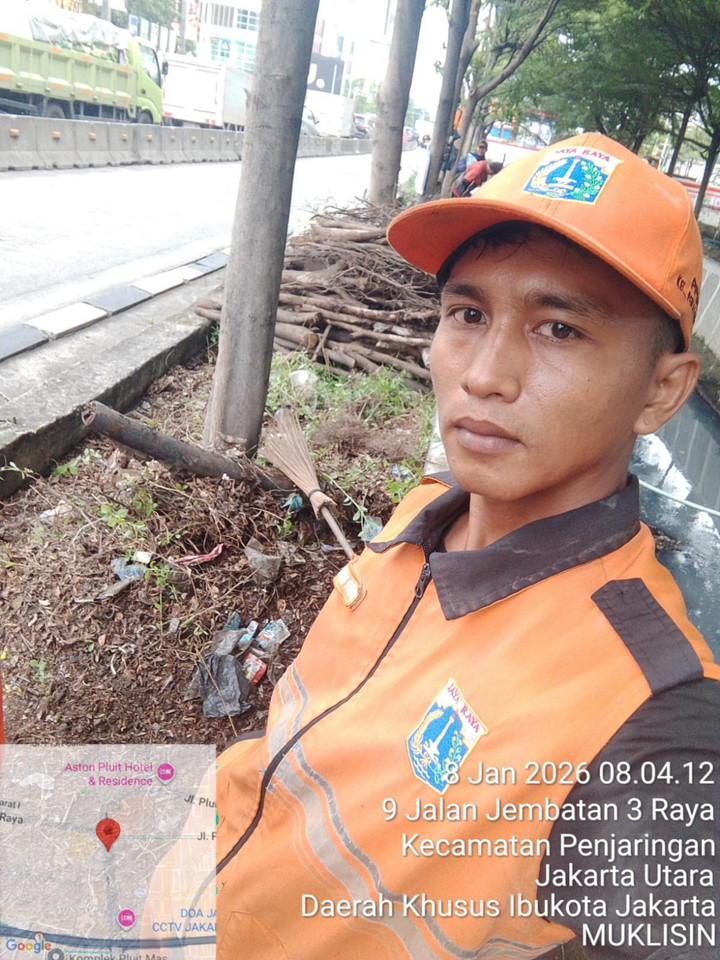 Di sisi lain, Mukhlisin menjalani rutinitasnya tanpa polesan. Setiap pagi, ia sudah bersiap sejak pukul 05.00 WIB untuk mulai bekerja pukul 06.00 WIB. Zona kerjanya berada di sepanjang Jalan Jembatan Tiga, dengan tanggung jawab sekitar satu kilometer area. Ia menyapu, mengumpulkan sampah, dan memastikan jalan tetap bersih hingga siang hari, lalu kembali bekerja setelah istirahat. Aktivitas itu dilakukannya hampir setiap hari, dengan sistem kerja bergilir termasuk akhir pekan.