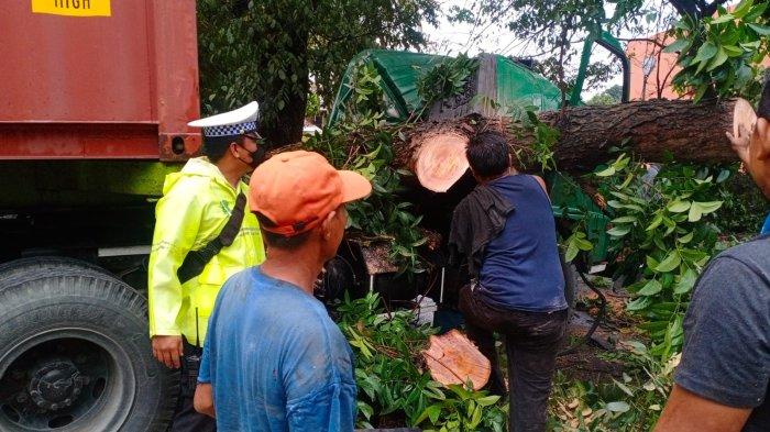 Dilihat dari dekat, kondisi kabin truk sangat rusak parah, terutama di bagian atap dan pintu kanan yang tertekan oleh batang pohon berdiameter besar. Petugas kepolisian tampak sigap melakukan pengaturan lalu lintas dengan sistem buka-tutup jalur. Seorang polisi berdiri di tengah jalan sambil meniup peluit, sementara mobil patroli dengan lampu rotator menyala memberikan peringatan kepada pengguna jalan.