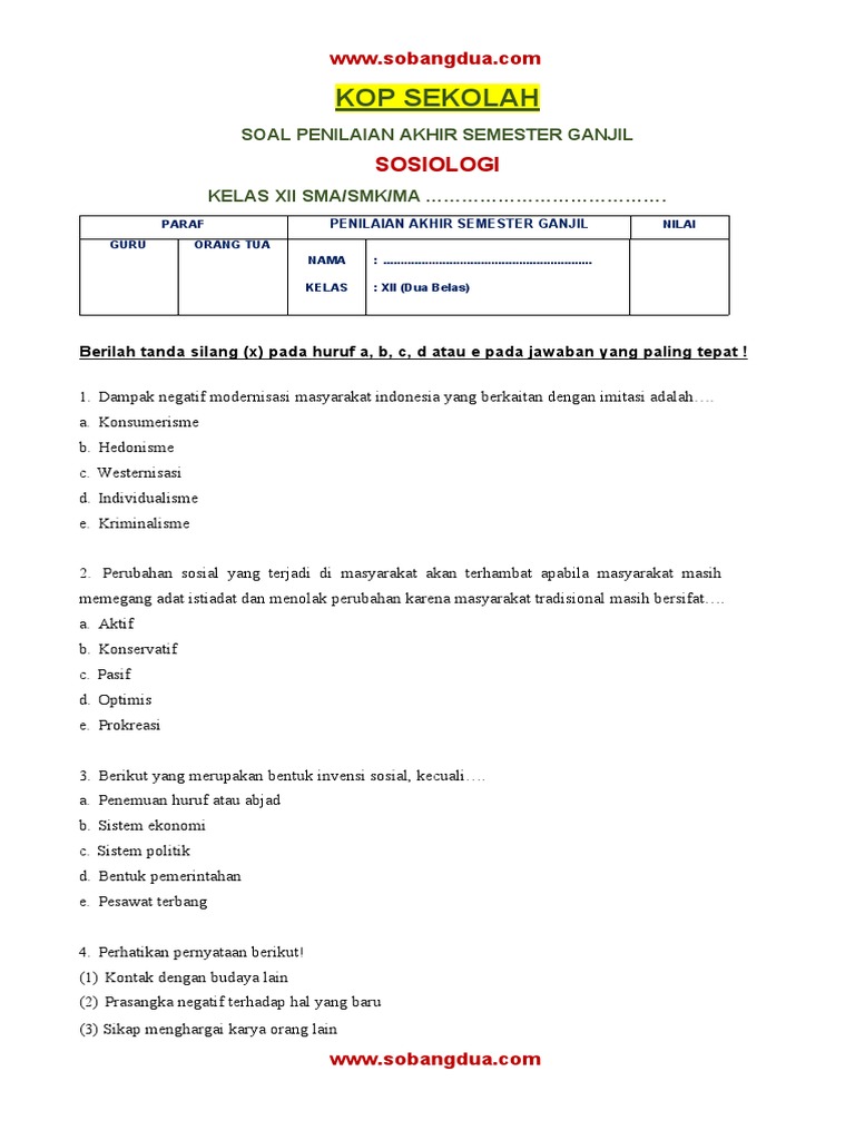 Latihan Soal PAS/SAS Sosiologi Kelas 12 SMA Semester 2 Kurikulum Merdeka Tahun 2026